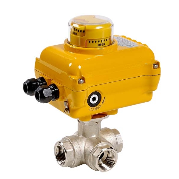 513-514+SA - Robinet sfera alama 3 cai cu actionare electrica SA deviere tip L sau T, protectie IP 67 pentru automatizarea instalatiilor industriale ce vehiculeaza apa, agent termic, aer comprimat si alte fluide compatibile.